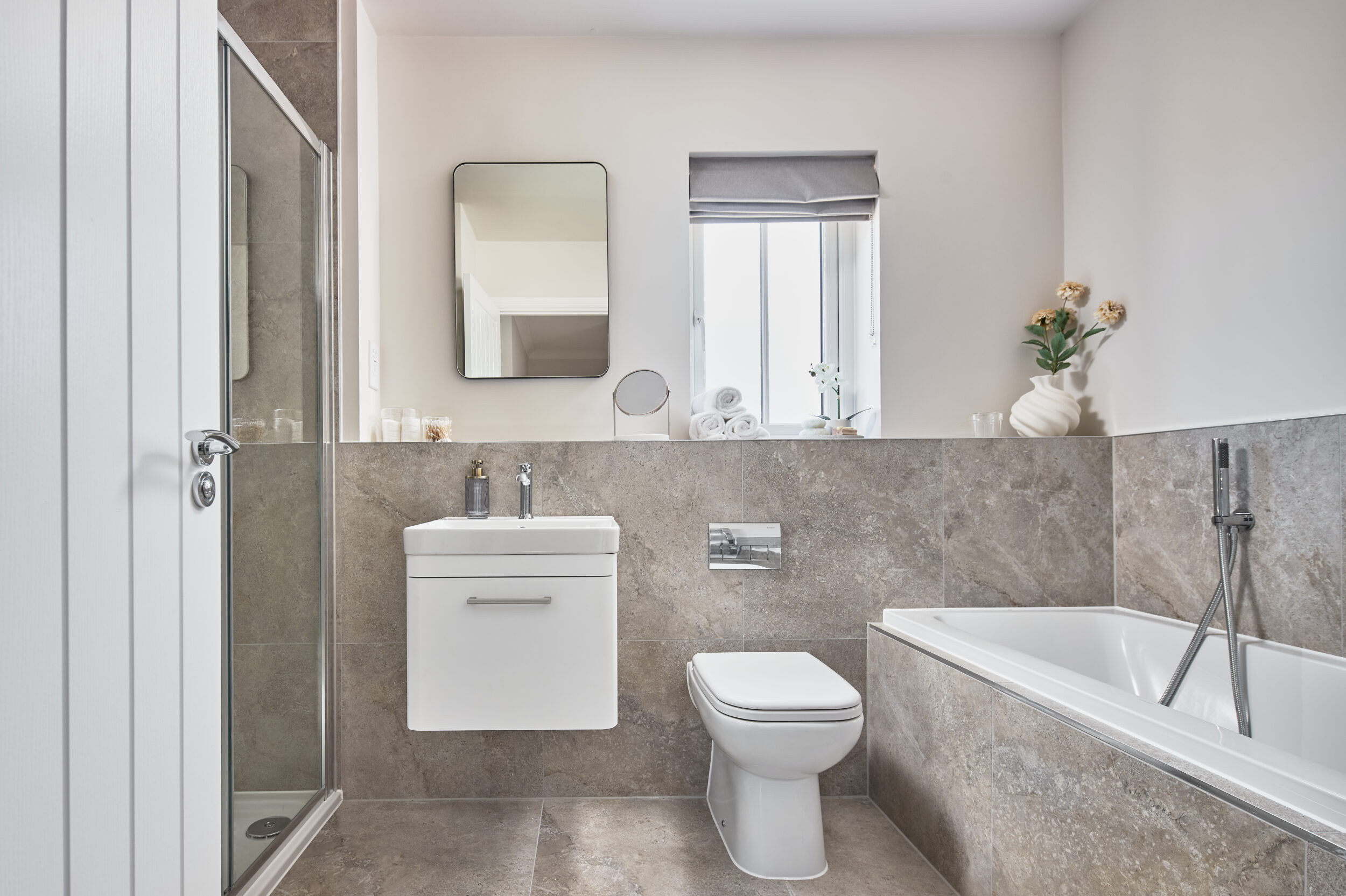 An Esquire bathroom is the perfect place to unwind, relax and feel refreshed. Bathrooms in all of our homes feature contemporary white sanitaryware with chrome fittings, heated electric towel rails, vanity units, shaver points and a shower over the bath with glass enclosure. En-suites include shaver points, vanity units, rainfall shower with additional handheld shower head. All cloakrooms benefit from vanity units, heated electric towel rails and underfloor heating. Separate shower enclosure and bath to family bathroom in The Juniper, Redwood and Ash. En-suite to bedroom two in The Ash.