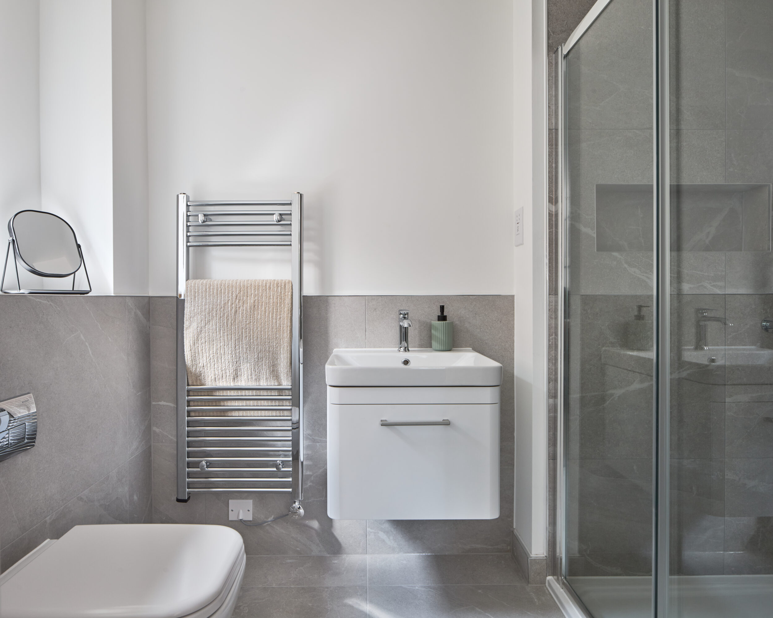An Esquire bathroom is the perfect place to unwind, relax and feel refreshed. Bathrooms in all of our homes feature contemporary white sanitaryware with chrome fittings, heated electric towel rails, vanity units, shaver points and a shower over the bath with glass enclosure. En-suites include shaver points, vanity units, rainfall shower with additional handheld shower head. All cloakrooms benefit from vanity units, heated electric towel rails and underfloor heating. Separate shower enclosure and bath to family bathroom in The Juniper, Redwood and Ash. En-suite to bedroom two in Ash.