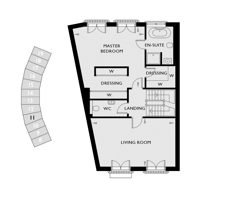 Master en-suites to The Wealden and The Goddard include a bespoke boutique hotel style concept with double vanity units, wall mounted taps, shaver sockets, rainfall shower with a stylish glass fluted door, and separate toilet enclosure. The freestanding bath is located centrally within the bedroom with a heated electric towel rail. Master en-suites to