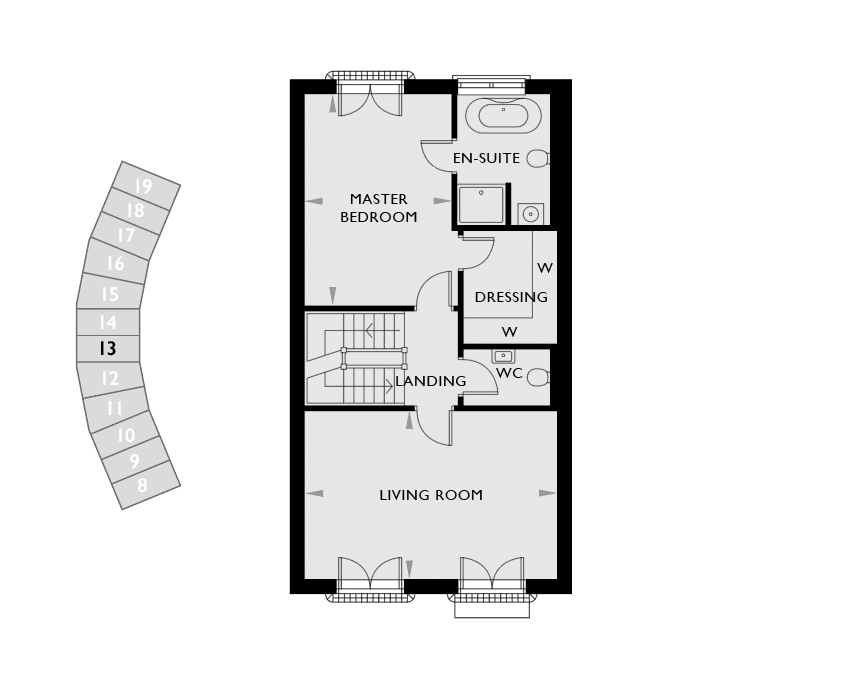 Master en-suites to The Wealden and The Goddard include a bespoke boutique hotel style concept with double vanity units, wall mounted taps, shaver sockets, rainfall shower with a stylish glass fluted door, and separate toilet enclosure. The freestanding bath is located centrally within the bedroom with a heated electric towel rail. Master en-suites to