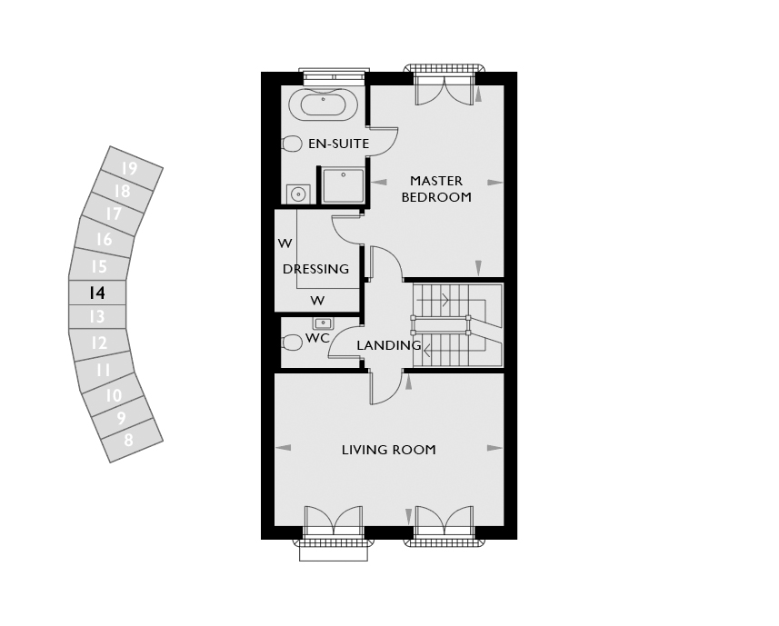 Master en-suites to The Wealden and The Goddard include a bespoke boutique hotel style concept with double vanity units, wall mounted taps, shaver sockets, rainfall shower with a stylish glass fluted door, and separate toilet enclosure. The freestanding bath is located centrally within the bedroom with a heated electric towel rail. Master en-suites to