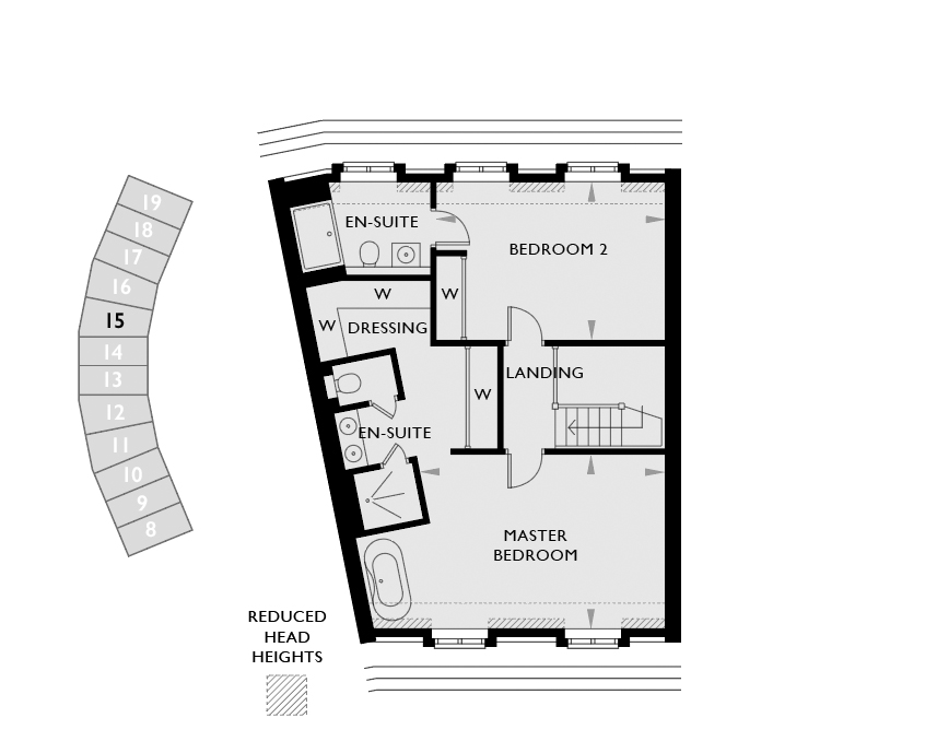 Master en-suites to The Wealden and The Goddard include a bespoke boutique hotel style concept with double vanity units, wall mounted taps, shaver sockets, rainfall shower with a stylish glass fluted door, and separate toilet enclosure. The freestanding bath is located centrally within the bedroom with a heated electric towel rail. Master en-suites to