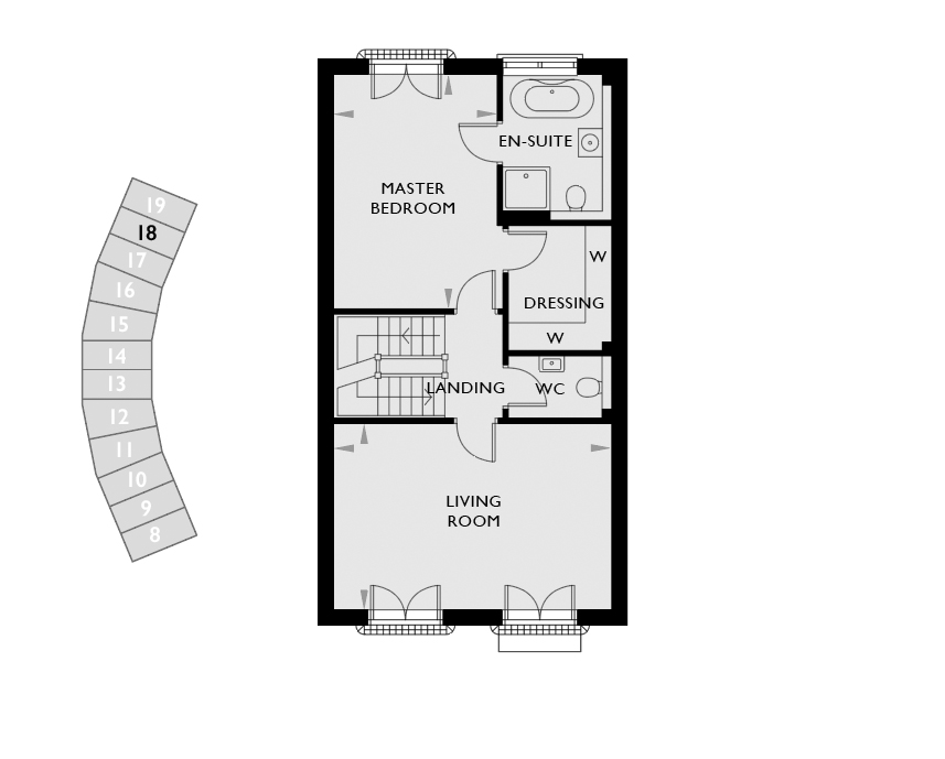 Master en-suites to The Wealden and The Goddard include a bespoke boutique hotel style concept with double vanity units, wall mounted taps, shaver sockets, rainfall shower with a stylish glass fluted door, and separate toilet enclosure. The freestanding bath is located centrally within the bedroom with a heated electric towel rail. Master en-suites to