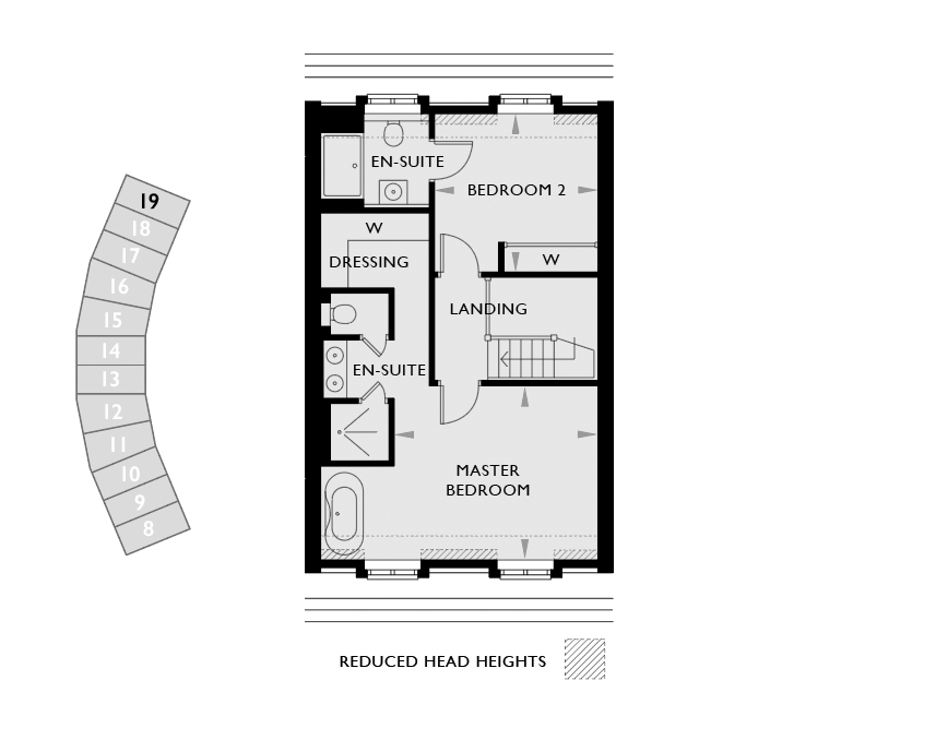Master en-suites to The Wealden and The Goddard include a bespoke boutique hotel style concept with double vanity units, wall mounted taps, shaver sockets, rainfall shower with a stylish glass fluted door, and separate toilet enclosure. The freestanding bath is located centrally within the bedroom with a heated electric towel rail. Master en-suites to