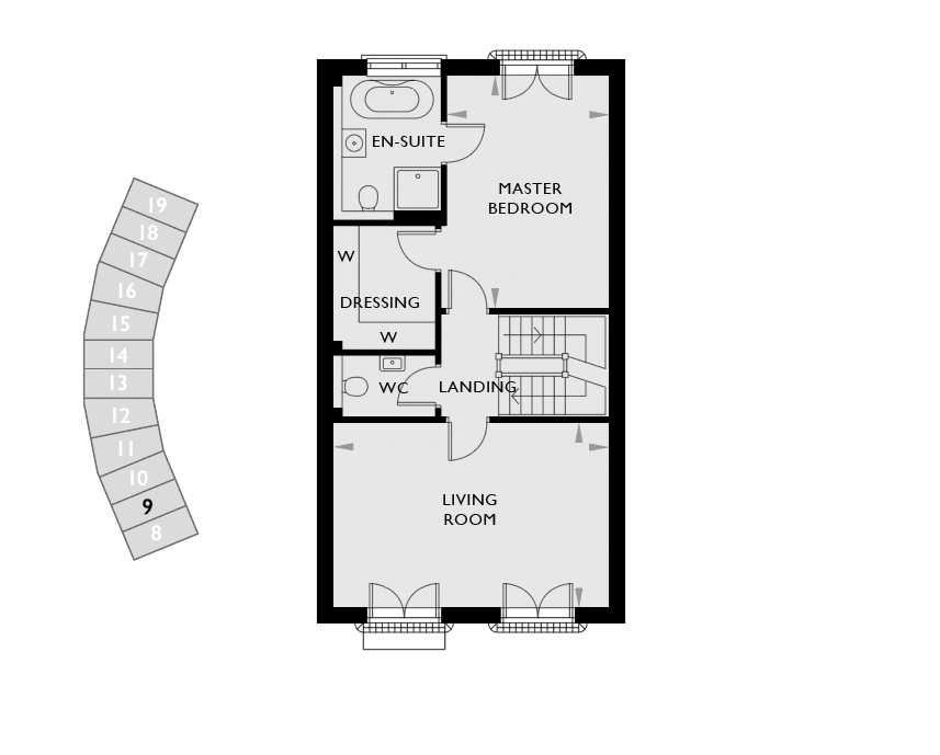 Master en-suites to The Wealden and The Goddard include a bespoke boutique hotel style concept with double vanity units, wall mounted taps, shaver sockets, rainfall shower with a stylish glass fluted door, and separate toilet enclosure. The freestanding bath is located centrally within the bedroom with a heated electric towel rail. Master en-suites to