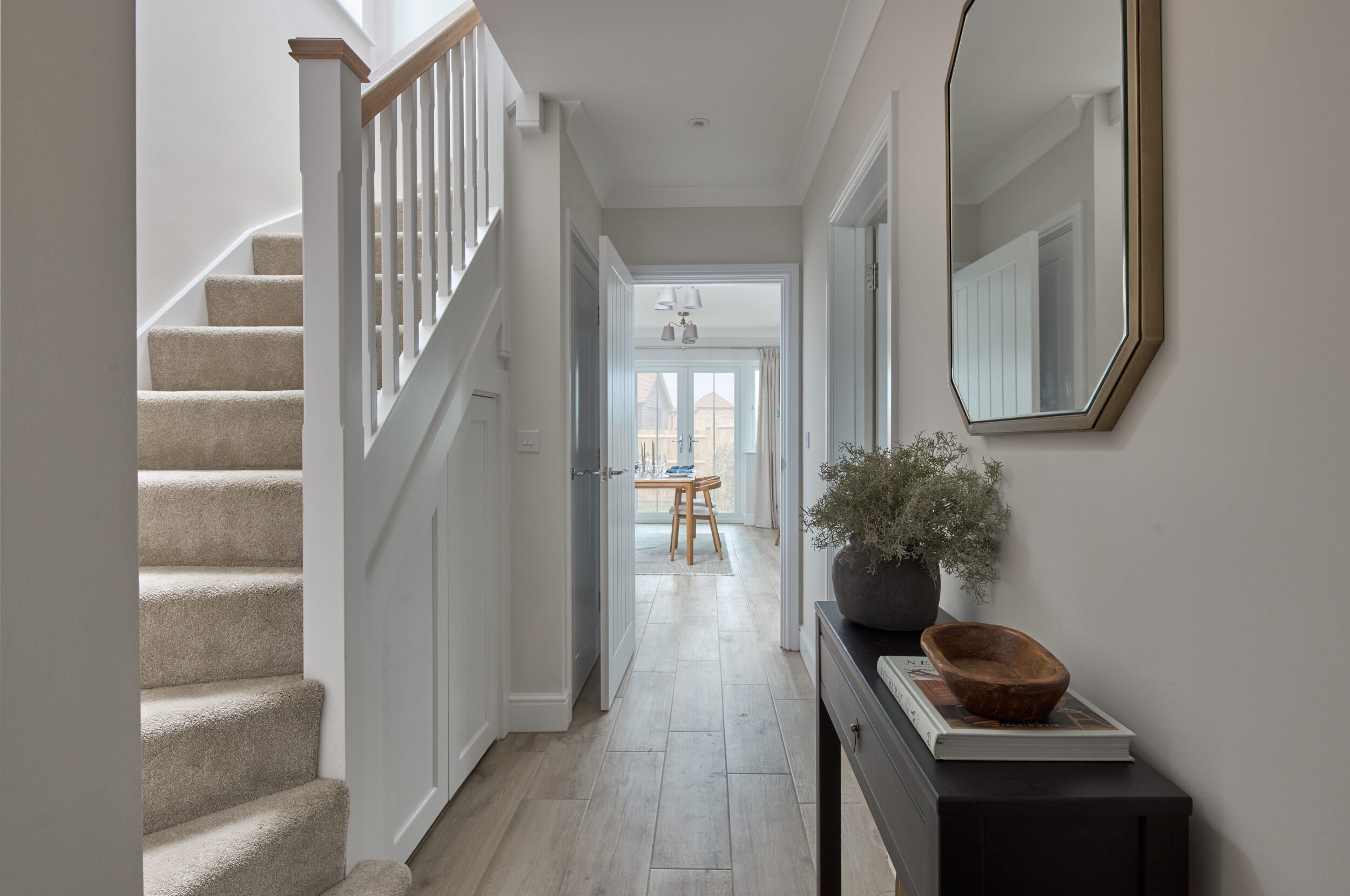 A choice of porcelain floor tiles to kitchen, utility, bathroom, en-suites and cloakroom, with a choice of porcelain wall tiles to bathroom and en-suites. Attractive white satin painted skirtings and architraves provided throughout, with white satin painted internal moulded doors with polished chrome ironmongery. Bespoke white painted staircase with oak handrail. Built in wardrobes to master bedroom, with pure white glass infills to all homes*. Built in wardrobes to bedroom 2 in the Apeldoorn, Alder and Hemlock. Dressing rooms to master bedroom in the Apeldoorn, Alder and Hemlock.